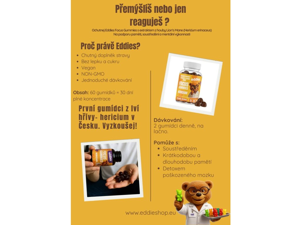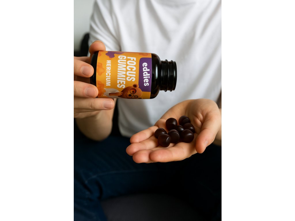 Cítíš, že ti občas v hlavě lítá pět věcí najednou a žádnou nedokončíš? Přesně pro takové dny jsme vyrobili Eddies Focus gumídci - funkční gumídky s extraktem z houby Lví hříva (Hericium), které ti pomůžou vrátit ostrost do myšlení. Bez návykovosti a bez polykání tablet a ještě ti budou chutnat.